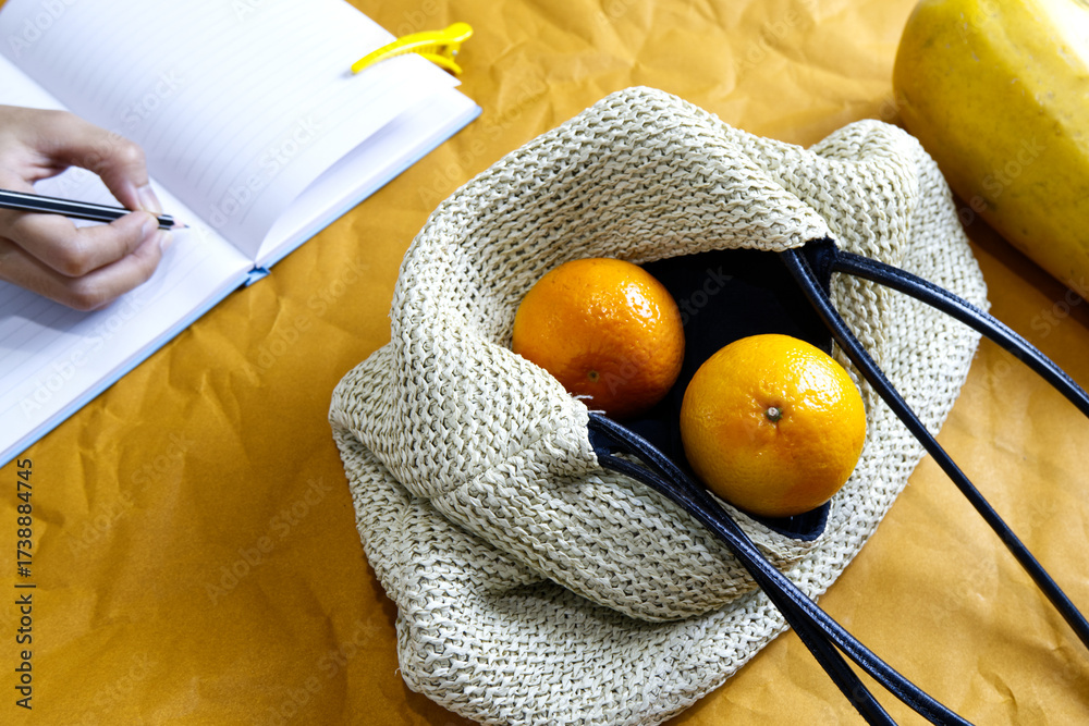 Oranges in bag and papaya with hand holding pencil writing on notebook. Top view fresh fruit on brown background with concept of healthy lifestyle, journal, diary, minimal, reusable for web, print.