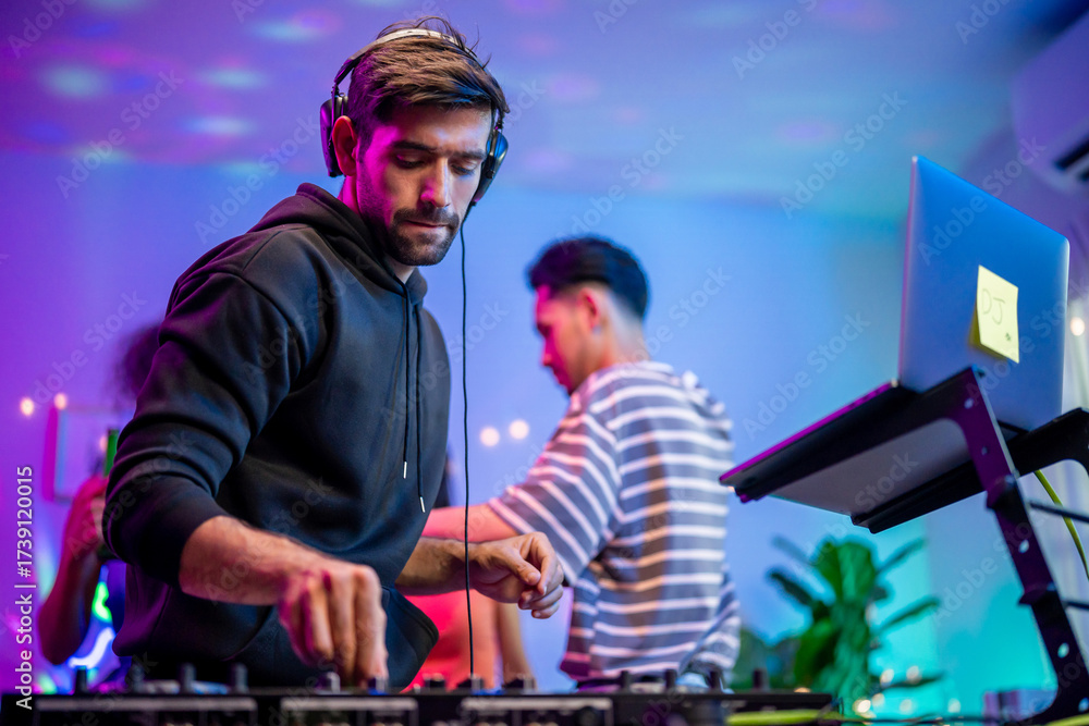 Caucasian young man artist DJ mixing and scratching music mixer controller.