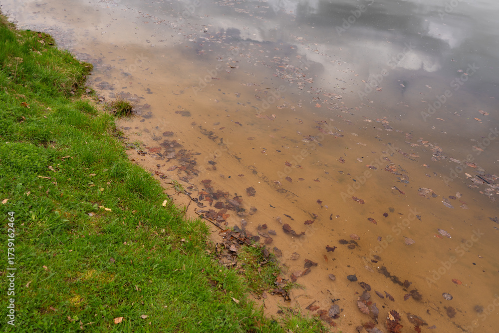 Peaceful sandy lake shore with scattered autumn leaves and vibrant green grass at Nova Zivohost in the Czech countryside. Tranquil natural scene ideal for eco, travel, or relaxation concepts.