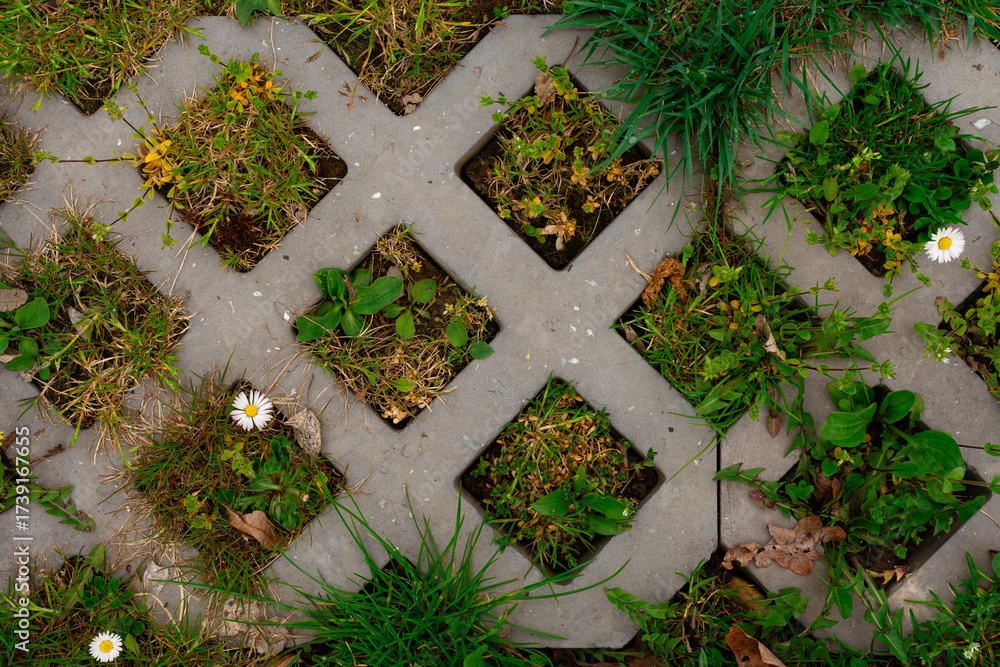 Concrete grid paver with green grass, weeds, and small daisies growing through the openings. Eco-friendly surface solution for soil drainage, erosion control, and green urban design. No people.