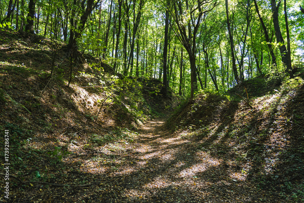 A dirt road running through a wild gully in the forest during summer