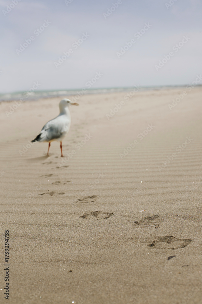 Seagull footprints in the sand with the sea in the background, a concept of nature and freedom
