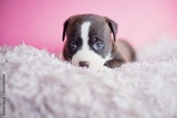 timid shy scared puppy n a soft fluffy blanket against a pastel pink background.