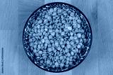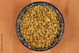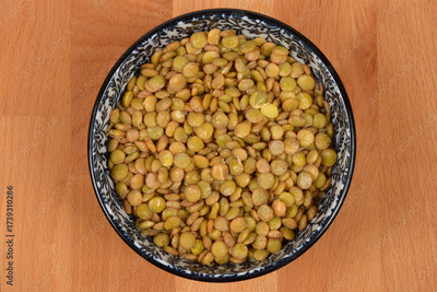 A decorative blue and white bowl filled with plump, soaked lentils is centered on a warm, light-brown wooden surface