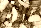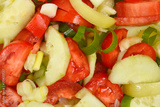 A detailed close-up shot shows a mix of freshly sliced salad vegetables, including red tomato wedges, green cucumber, pepper slices, and chopped spring onion