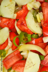 A detailed close-up shot shows a mix of freshly sliced salad vegetables, including red tomato wedges, green cucumber, pepper slices, and chopped spring onion
