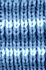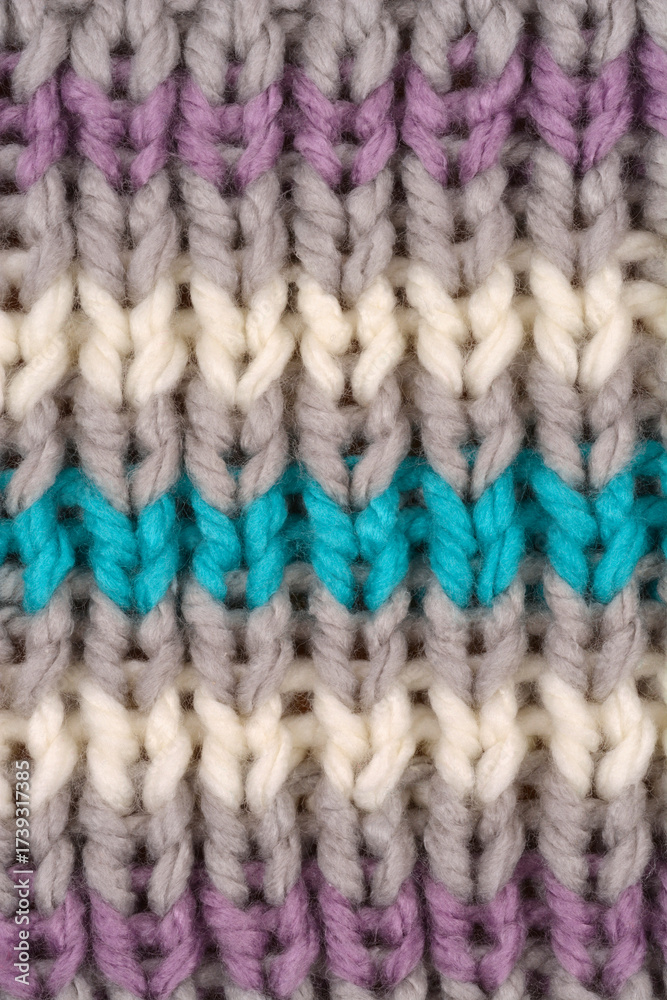A detailed macro shot showcases the texture of a coarsely knitted fabric with horizontal stripes in gray, cream, purple, and a prominent turquoise color running down the center