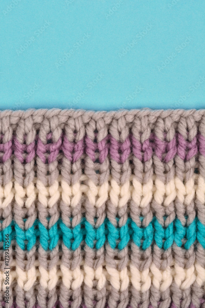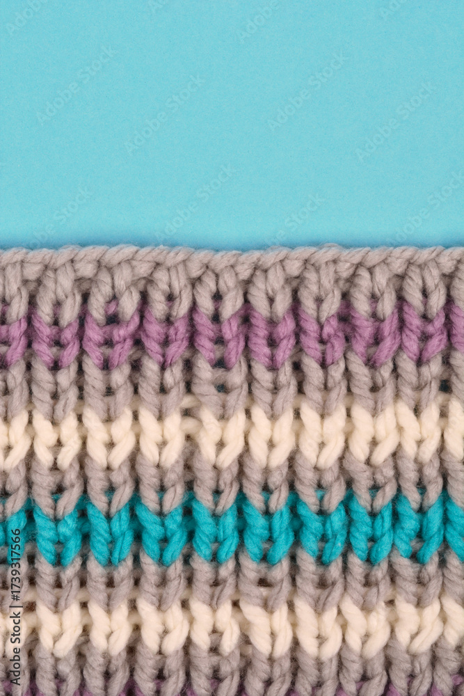 A horizontaly oriented macro shot shows a striped pattern of chunky knitted fabric in gray, cream, purple, and turquoise, with blank pastel blue copy space on the top