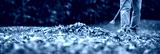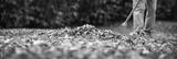 Raking fallen leaves from lawn in autumn garden. Panoramic view at gardener with rake. Gardening equipment and tool