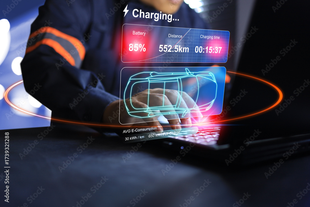 Electric vehicle concept with the engineer monitoring life time of EV car battery and charging on virtual screen represent to preventive maintenance