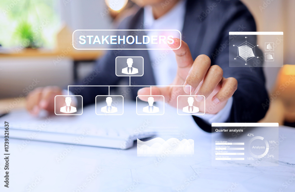 stakeholders concept with businessman working on virtual interface to show who is involved with organization, society and has responsibilities