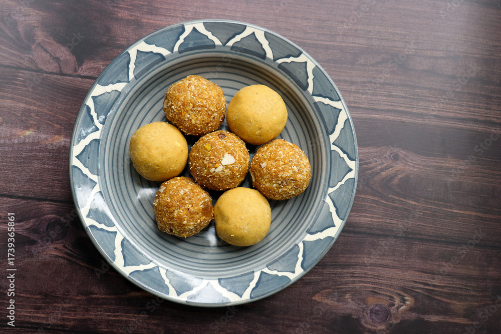 Gond, methi ke laddoo also known as Dinkache ladu in Marathi and Indian Traditional Sweet Food Besan ke Laddu. Indian festival sweet. Diwali faral or snacks. copy space. Gram flour sweet Ladoo.