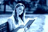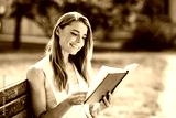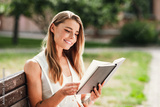 Young woman sitting on park bench reading a book on a sunny day enjoying calm leisure and outdoor study in a peaceful park setting