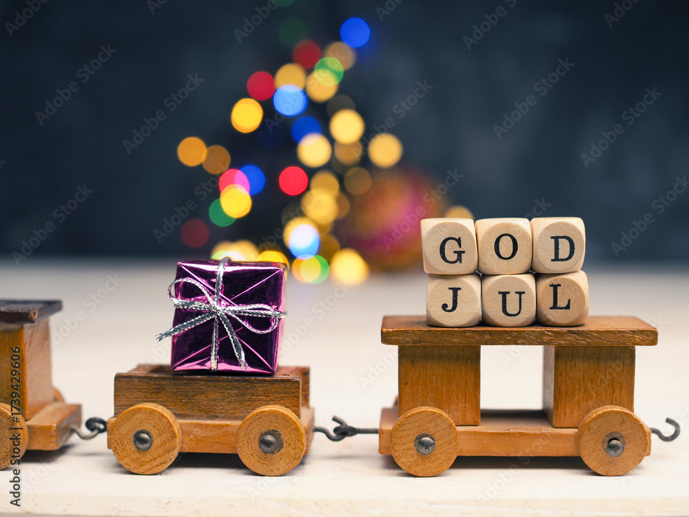 Small wooden train set with God Jul on blurred lights, Scandinavian Christmas