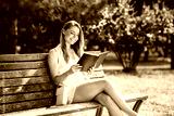 Young woman reads a notebook on a sunny outdoor park bench enjoying a peaceful moment and casual fashion style in summer light