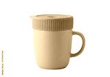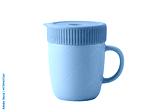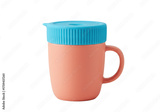 Isolated peach-colored drinking cup with blue lid, easy-grip handle, for toddlers and children