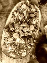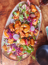 A big platter of seafood salad with seared salmon, lettuce, basil, radish and wheat sprouts