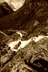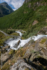 Waterfall Kleivafossen fed by Briksdal Glacier. Olden, Vestland, Norway
