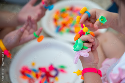 A group of children working with colorful beads during a preschool art activity, learning creativity, teamwork, and fine motor skills through fun play in early childhood.