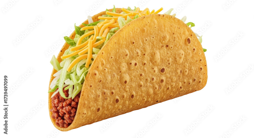Isolated hard-shell taco with seasoned ground beef, shredded lettuce, and cheddar cheese