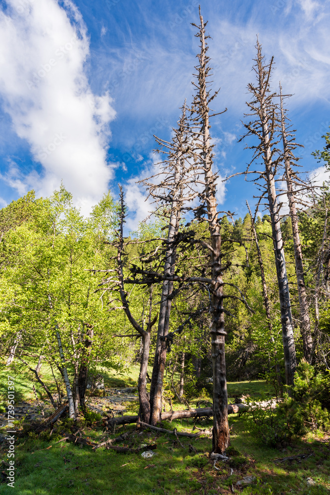 Dead trees rise among vibrant forest life under a blue sky, capturing nature’s contrast and quiet resilience. Dry trees and fresh green forest under a bright blue sky with white clouds.