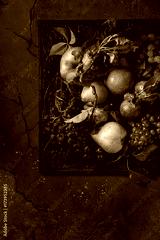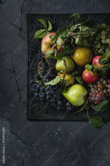 Variety of autumn fruits ripe organic apples, three kind of grapes, pears with leaves on metal ornate tray over dark texture background. Top view with space