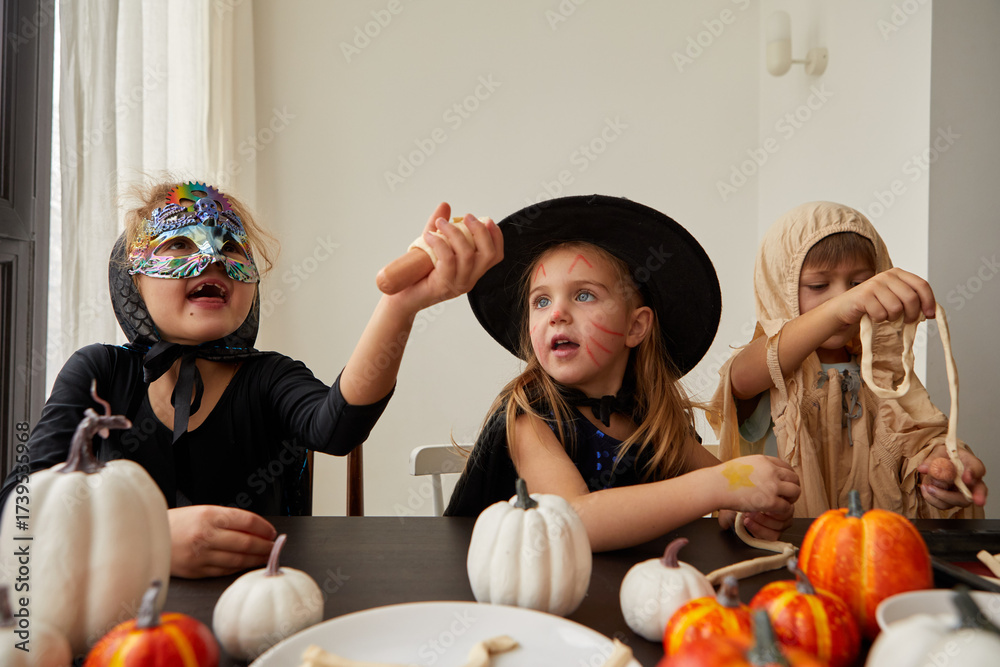Children in colorful costumes enjoy joyful Halloween festivities with pumpkins and fun props all around