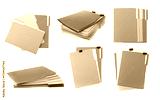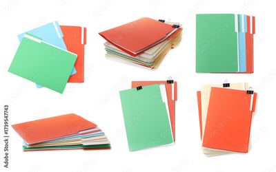 Documents in colorful file folders with binder clips isolated on white, set