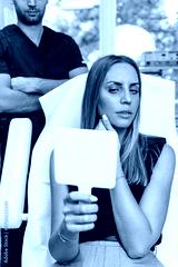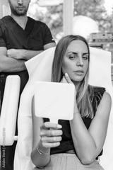 Beautiful and happy young woman sitting in medical chair and looking in the mirror. She is satisfied after successful beauty treatment with hyaluronic acid fillers or botulinum toxin injections.