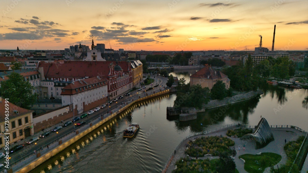 Evening Panorama of Wrocław – Aerial View with Illuminated Street Lamps
