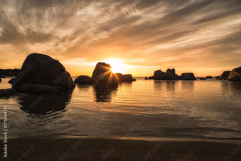 Sunrise over boulders on Cavallo Island south of Corsica