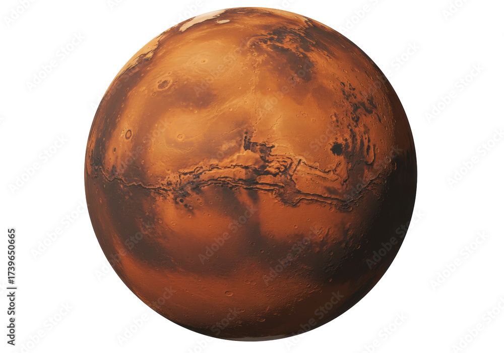 Detailed Mars planet isolated, the red planet with canyons and craters, space exploration and science concept, no background