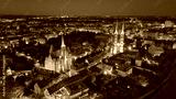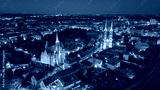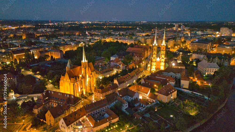 Evening Panorama of Wrocław – Aerial View of Ostrów Tumski with Illuminated Street Lamps