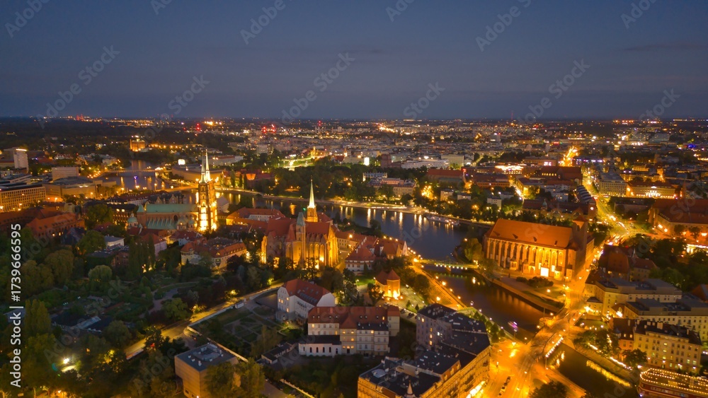 Evening Panorama of Wrocław – Aerial View of Ostrów Tumski with Illuminated Street Lamps