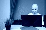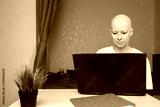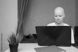 Bald young woman focused on laptop, small dog relaxing on pillow behind, concept of support, companionship and hope
