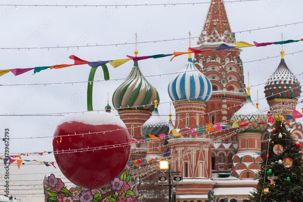 Christmas fair in winter on Red Square in Moscow, vibrant street markets with happy crowds and traditional Russian decorations, city lights adding charm to December nights.