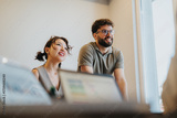 A couple in a bank interacts with an advisor, discussing financial options, loans, and opportunities. Bright setting conveys collaboration, advice-seeking, and planning for future financial solutions.
