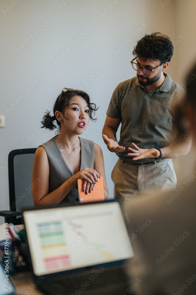 A young couple consulting with a financial adviser in a bank, discussing loans and advice, conveying professionalism, planning, and engagement in a modern office environment with charts and notes.