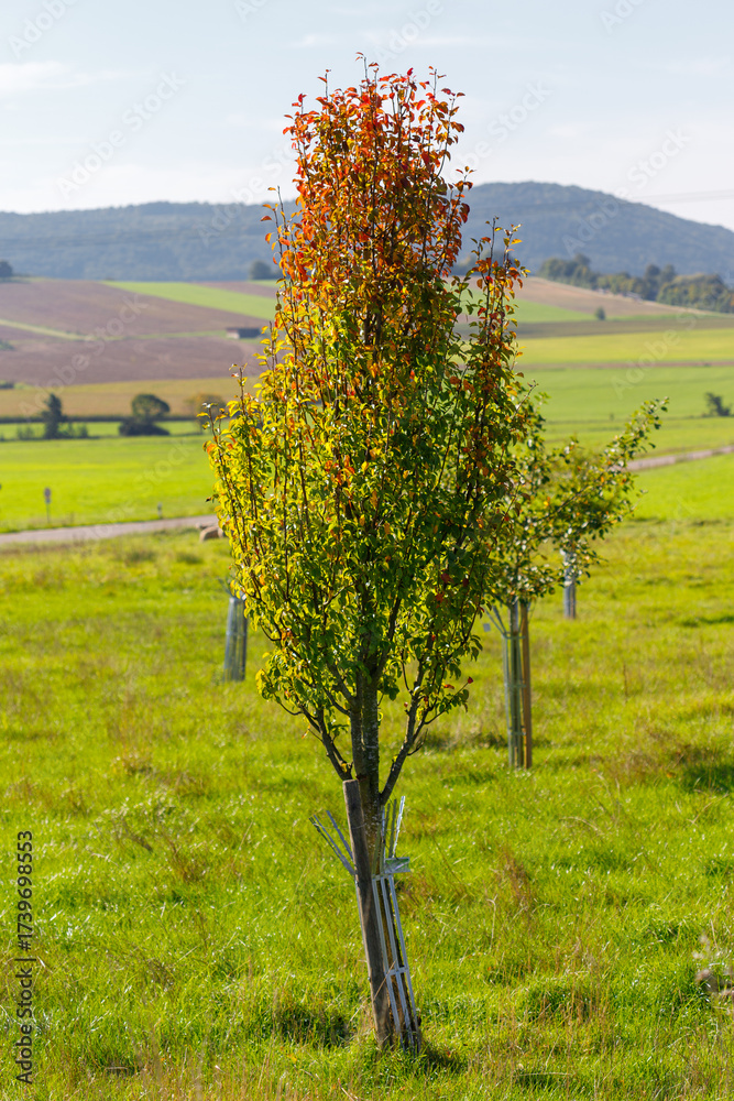 Young tree with fall foliage in a field