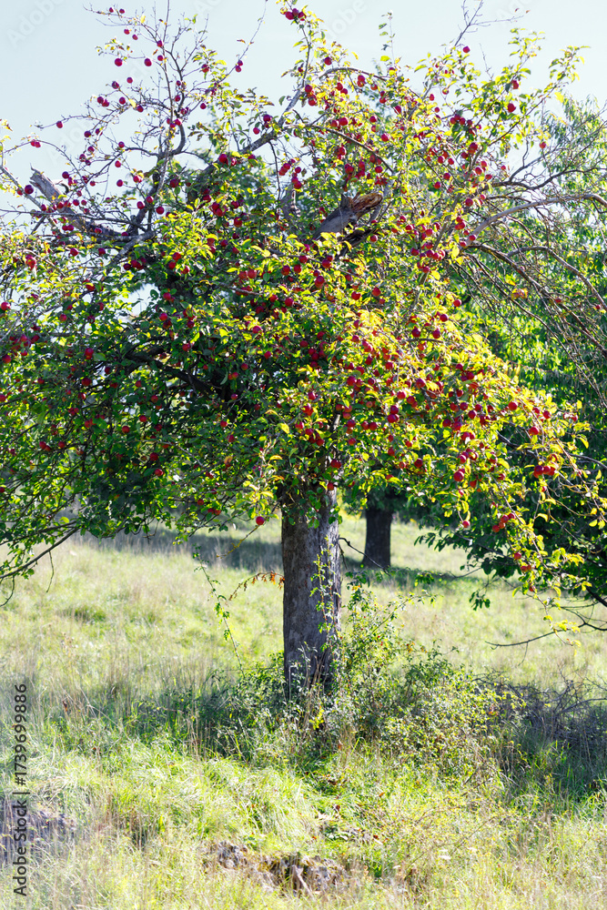 Apple Tree with Ripe Fruit in Grassy Field