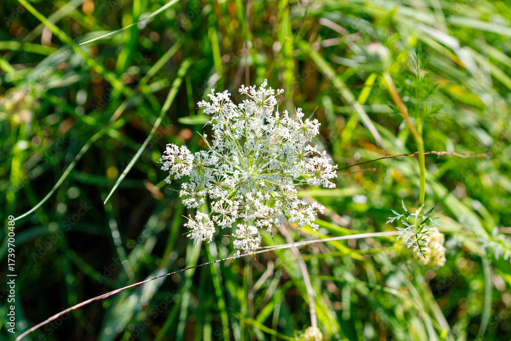 White Queen Anne's Lace Flower Head with Green Foliage
