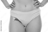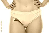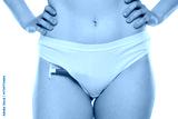 Studio shot of woman’s torso with pink razor tucked into underwear on white background.