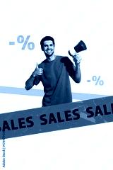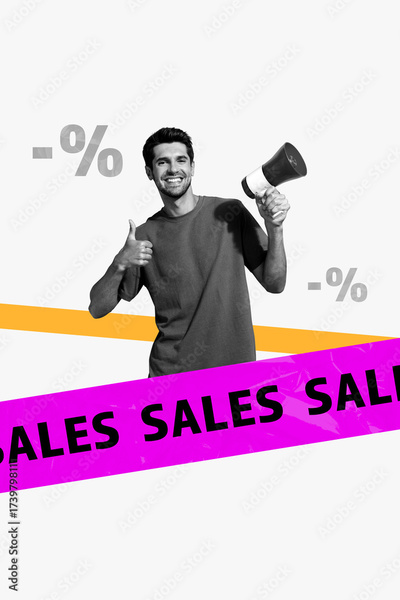 Trendy vertical zine art pop trend collage of happy man hold megaphone percentage announcement black friday sale bargain low price