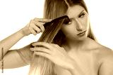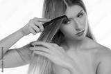 Studio shot of young blonde woman brushing long straight hair while looking aside on white background.
