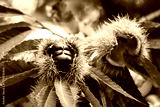Three sweet chestnuts (Castanea sativa) bursting from their spiny burrs in autumn on a sweet chestnut tree in the Dordogne region of France