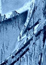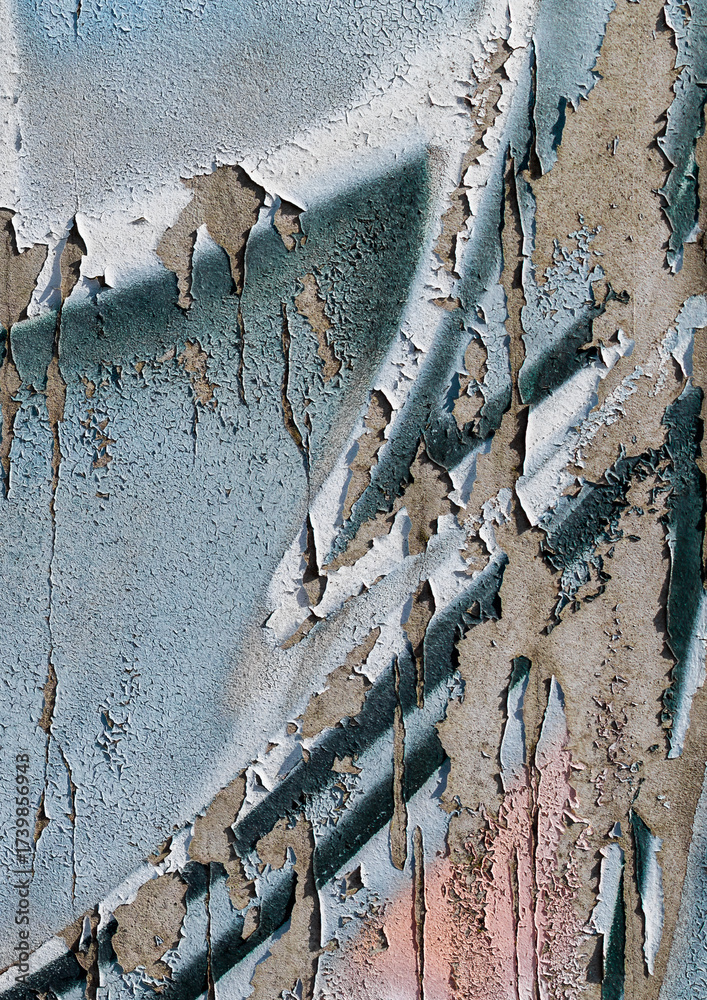 cracked and peeling paint on a wall surface. The weathered texture shows layers of faded blue and white paint flaking off, revealing an aged and distressed background. Perfect as a grunge overlay.