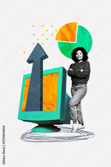 Poster sketch photo collage of diagram piece goal business target analyzing success arrow up obsolete computer monitor young woman stand