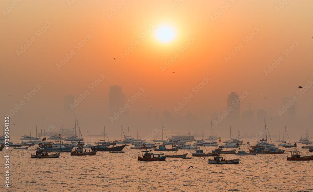 Air pollution concept - Modern highrise rich buildings and poor slums at sunset - Mumbai, india
