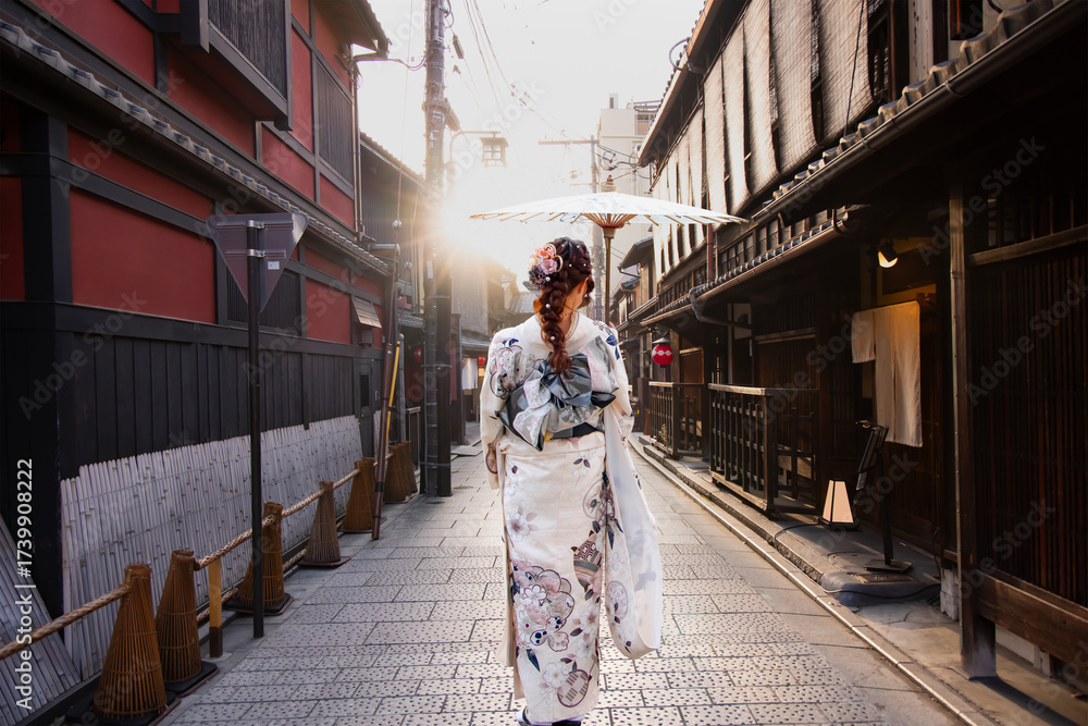 Young woman wearing traditional japanese kimono in kyoto's gion district - Gion District, Japan