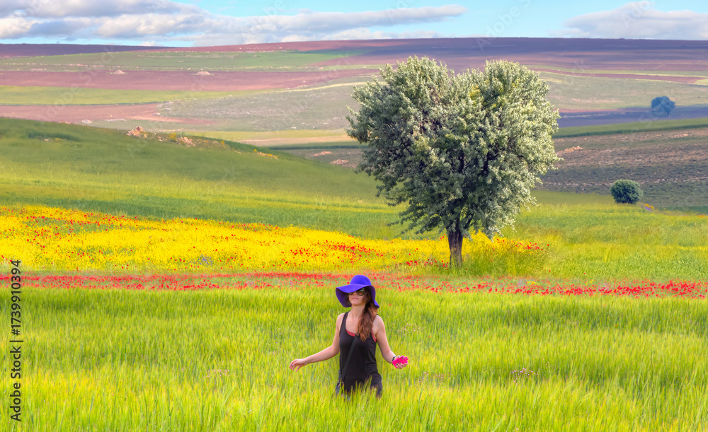 Beautiful young girl in purple hat stands in poppy field - A young olive tree in the shape of a heart with rainbow - Agriculture field with young olive grove between meadow of poppies and yellow wild
